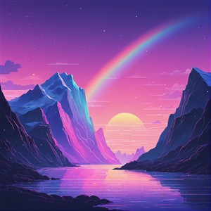 Drømmende bjerglandskab med regnbue