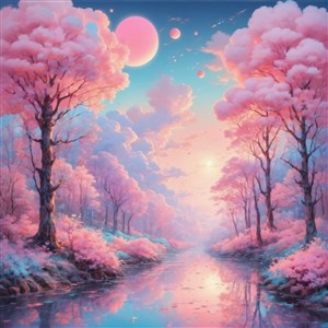 Drømmende landskab med lyserøde træer