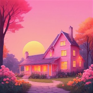 Drømmende pink hus ved solnedgang