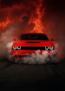 Rød bil i røg og flammer
