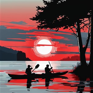 Rød solnedgang over søen med kajakroere