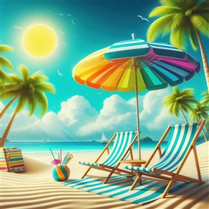 Solrig Strand med Parasoller og Stole