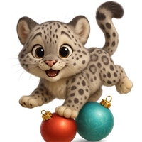 Legesyg sneleopardunge med julekugler