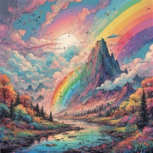 Farverig bjerglandskab med regnbue