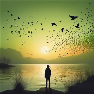 Fugle over søen ved solnedgang