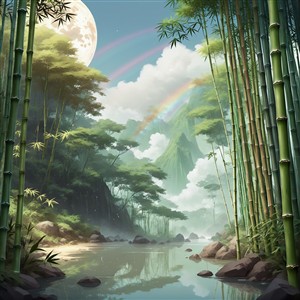 Frodig Bambusskov med Regnbue
