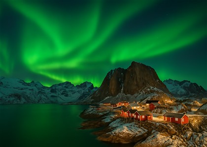 Nordlys over fjord og bjerge
