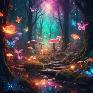 Magisk Skov med Lysende Svampe og Sommerfugle