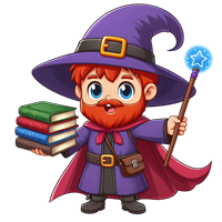 Lille troldmand med bøger og tryllestav