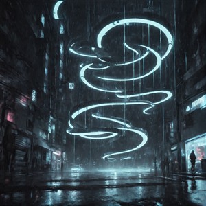 Futuristisk bylandskab i regnvejr