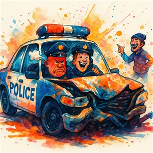 Humoristisk skildring af politibil med komiske betjente