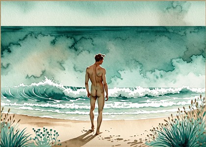 En mand ved havet i akvarel