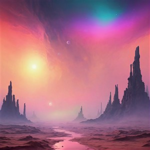 Fantastisk sci-fi landskab med farverige himmelstræk