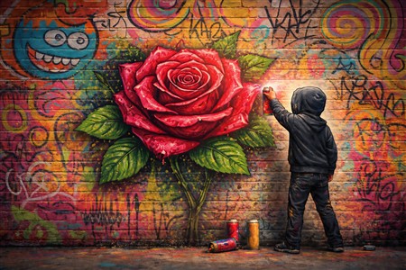 Street Art: A Boy Painting a Vibrant Rose