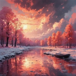 Vinterlandskab med solnedgang
