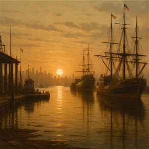 Solnedgang over havnen med skibe