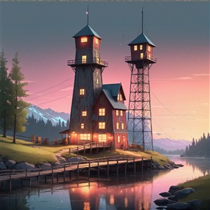 Malersk Landsby med Tårne ved Solnedgang