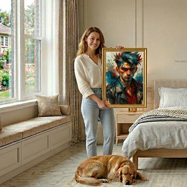 Intens Portræt af Ung Mand med Farverig Baggrund