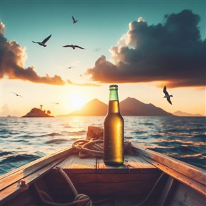 Solnedgang på vandet med en ølflaske