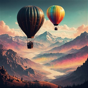 Farvestrålende luftballoner over bjergene