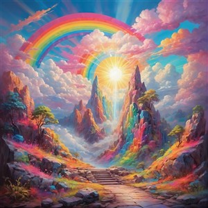 Farverig bjerglandskab med regnbue og solopgang