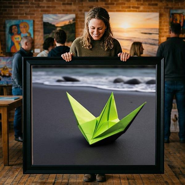 Grøn Origami Fuglefigur ved Vandkanten